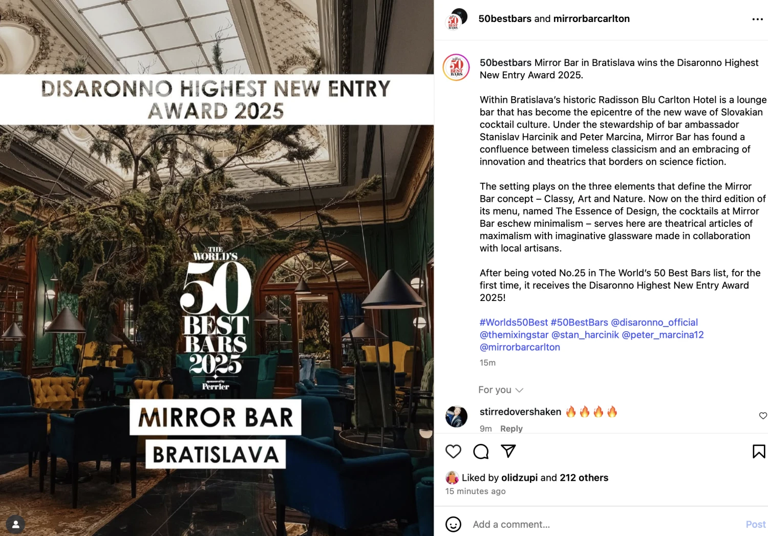 Po prvý raz v histórii sa Mirror Bar prebojoval do prestížneho rebríčka The World’s 50 Best Bars, a to rovno na 25. miesto. Odborníci mu zároveň udelili ocenenie Disaronno Highest New Entry Award 2025, ktoré získava nováčik s najvyšším umiestnením v rebríčku.