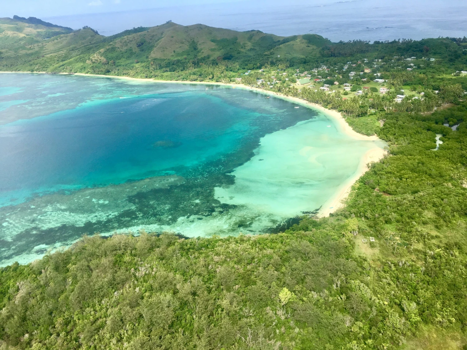 Z Nadi sa na ostrovy Yasawa dostanete dvomi spôsobmi. Loďou môže cesta trvať aj päť hodín, hydroplánom len tridsať minút, takže ak máte možnosť, určite radšej leťte. Výhľady z okna na ostrovy pod vami, ktoré budete míňať, vám v tom najlepšom zmysle slova vyrazia dych. Náš let mal len štyroch pasažierov, z toho jedného štvornohého, ktorý sa vracal so svojím majiteľom od zverolekára. A tak mi počas letu pes obhryzkával koreň kavy, ktorý mi trčal z ruksaku, kým ja som mala pohľad prilepený k okienku a sledovala krásu pod nami. Hydroplán zaparkoval pri pontóne, kde nás čakal malý čln a ten nás dopravil k brehom dediny Naisisili na ostrove Nacula.