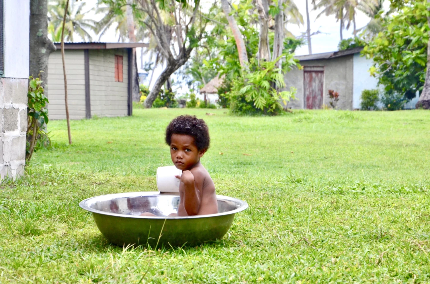 Nespomenula som kávu (tú s dĺžňom), tú nepijú vôbec, ale po večeri prišlo od miestnych mužov pozvanie na tú bez dĺžňa. Pripravili pre nás privítací sevusevu rituál, pri ktorom sa koreň kavy pomelie na jemný prášok, v drevenej nádobe sa zmieša so studenou vodou a podáva sa v kokosových mištičkách. V tunajších podmienkach drevenú nádobu na kavu nahradil obyčajný plastový lavór, okolo ktorého sme sedeli asi desiati. Jeden z mužov nasypal kavu do plátenného vrecúška a poriadne ho v tom lavóre vyplákal rukami. Nedá sa porátať, koľkokrát mi počas tejto cesty zišlo na um, že som sa mala dať pre istotu zaočkovať proti brušnému týfusu.