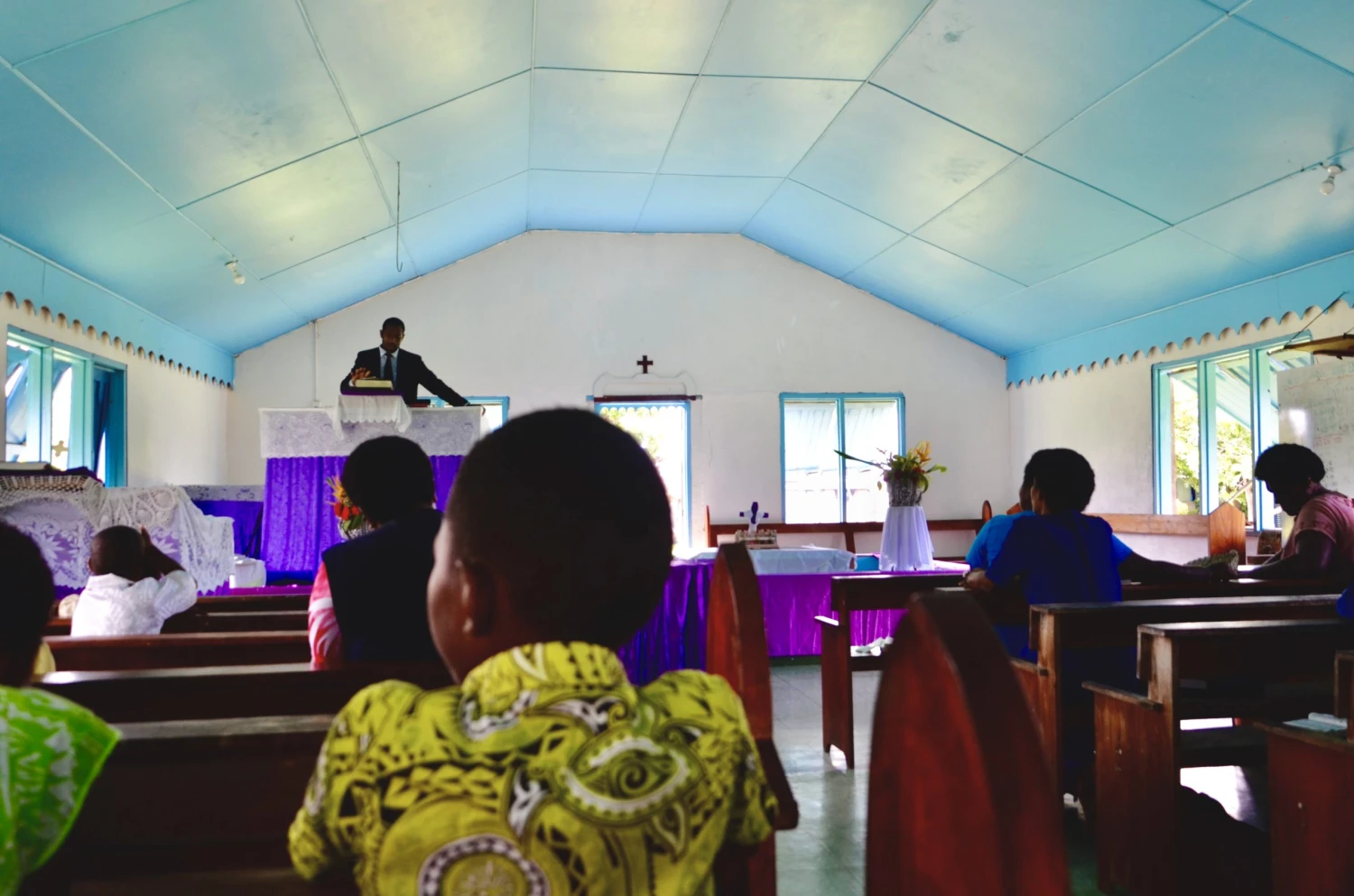 Nedeľa je v Naisisili dňom oddychu. Nikto nepracuje a všetci sú už od rána krásne vyobliekaní a pripravení na omšu v kostole. Eta zhodnotila, že naše oblečenie nie je na takúto príležitosť dostatočne slávnostné, tak mi požičala tradičné dlhé šaty po svojej dcére a slušivú modrú košeľu, a zavinovaciu sukňu sula pre muža. V kostole sa zišla celá dedina. Pastor najskôr zanietene kázal v domorodom jazyku, a keď sa začalo spievať, všetci sa postavili a tancovali v rytme hudby. Bolo to magické, i keď som im nerozumela ani slovo. Po bohoslužbe nás pastor pozval do svojho domu, kde jeho žena pripravila doslova slávnostné hody.