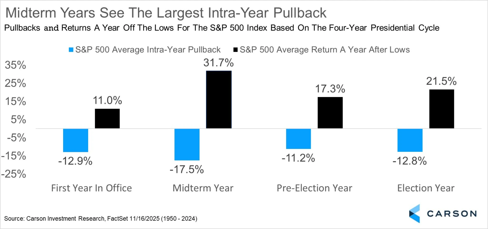 V druhom roku volebného obdobia dochádza k najväčším poklesom od vrcholu ku dnu. Zdroj: Carson Investment Research.