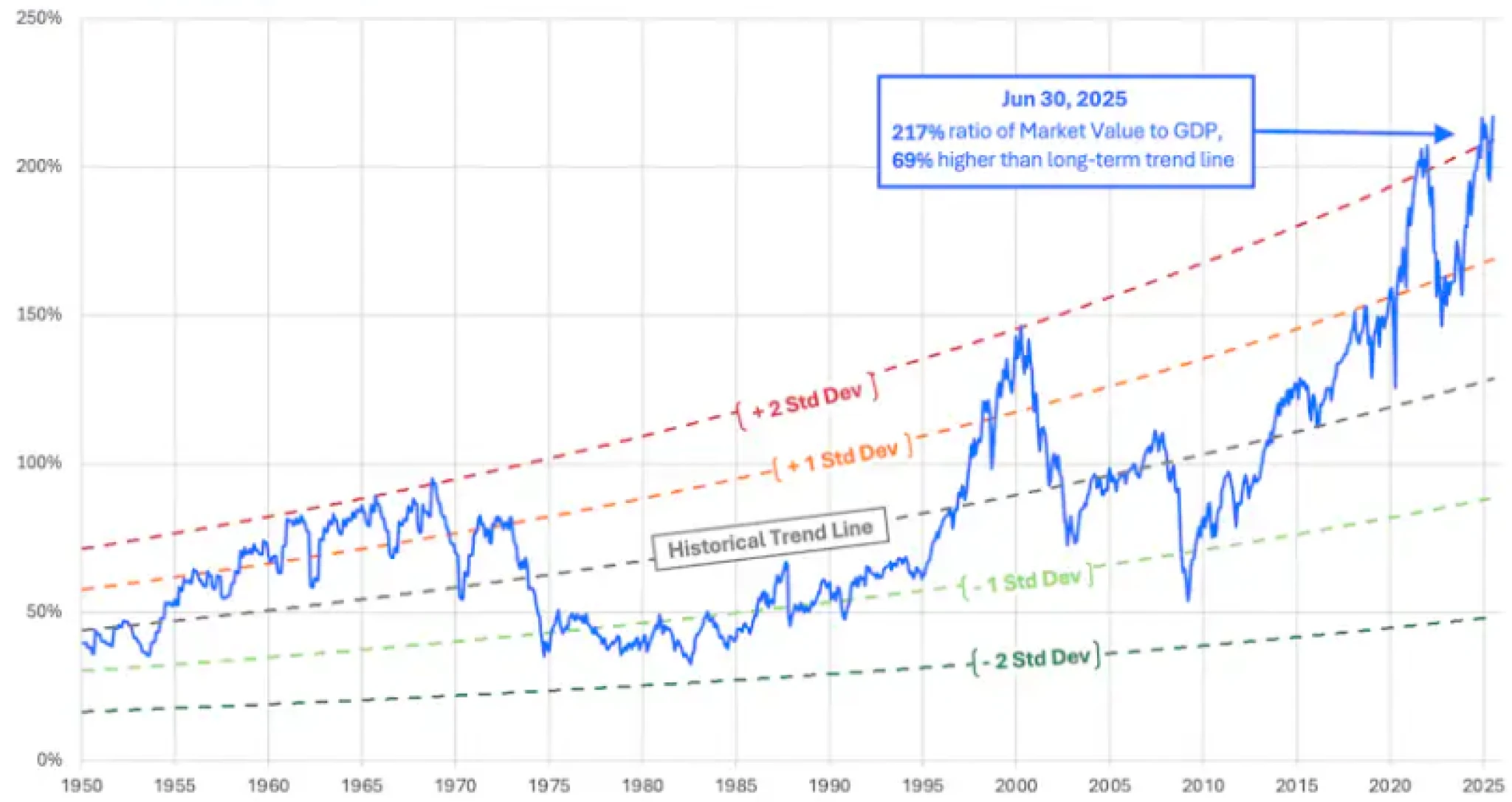 Posledné úrovne metriky vyvolávajú vážne obavy. Celková hodnota akciového trhu dosiahla na konci polroku 65,47 bilióna dolárov a hrubý domáci produkt predstavoval 30,15 bilióna. Buffettov indikátor tak dosiahol úroveň 217 percent.