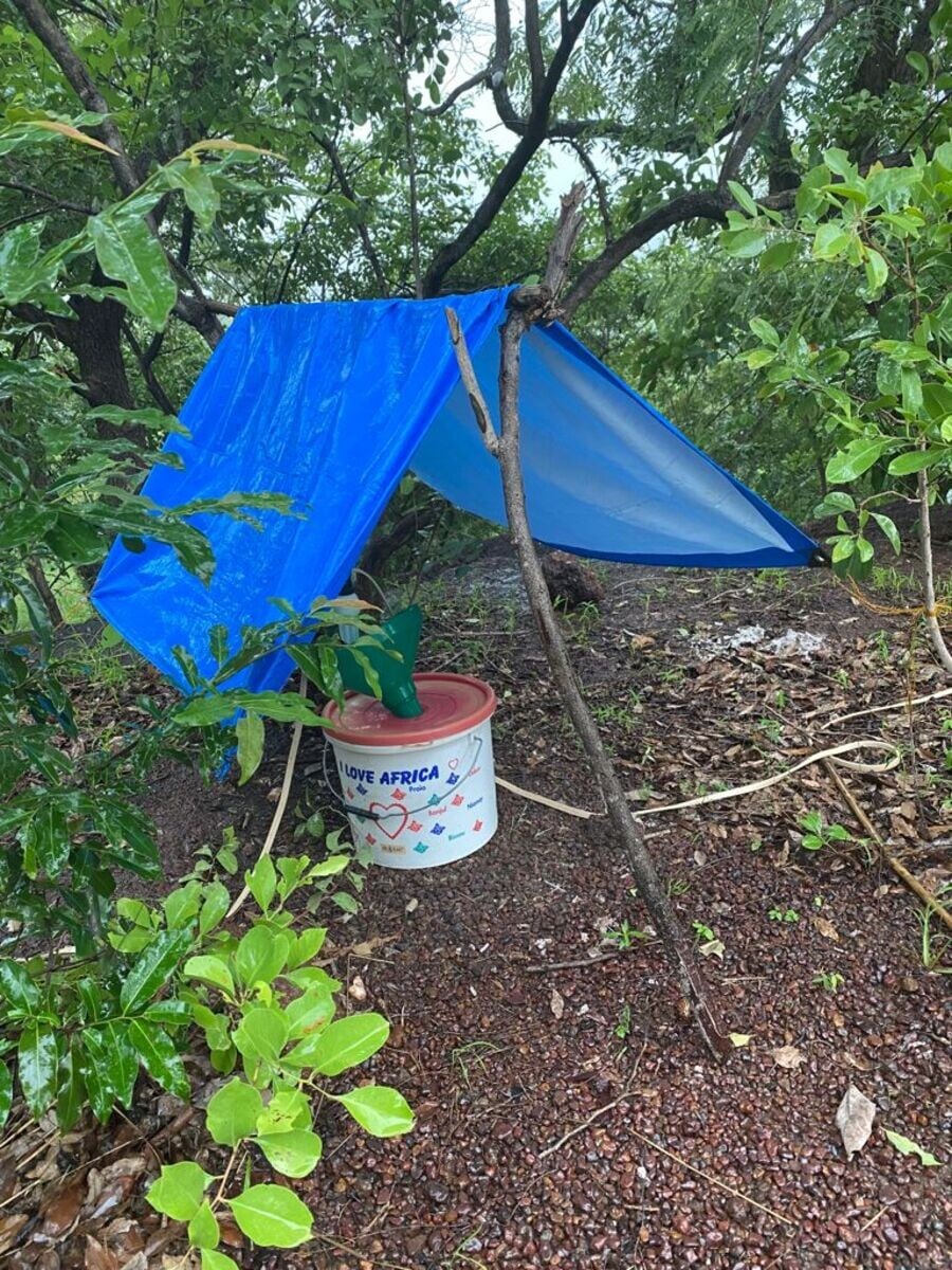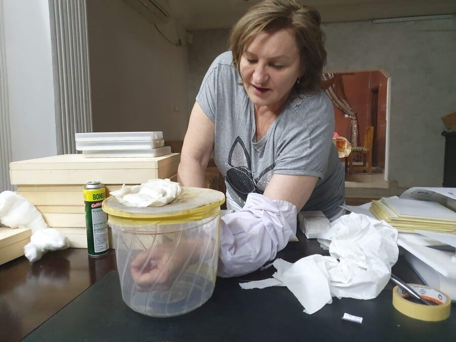 Nakúpili sme sto fliaš minerálky a sto párov bielych ponožiek, ktoré som musela niekoľkokrát vyprať, aby sa zmyli akékoľvek prísady a pach. Sušila som ich vonku pred hotelom, ľudia sa čudovali. Na malú fľašku z minerálky sme potom natiahli bielu bavlnenú ponožku a nad ňu sme dali umelohmotný tanierik ako striešku.