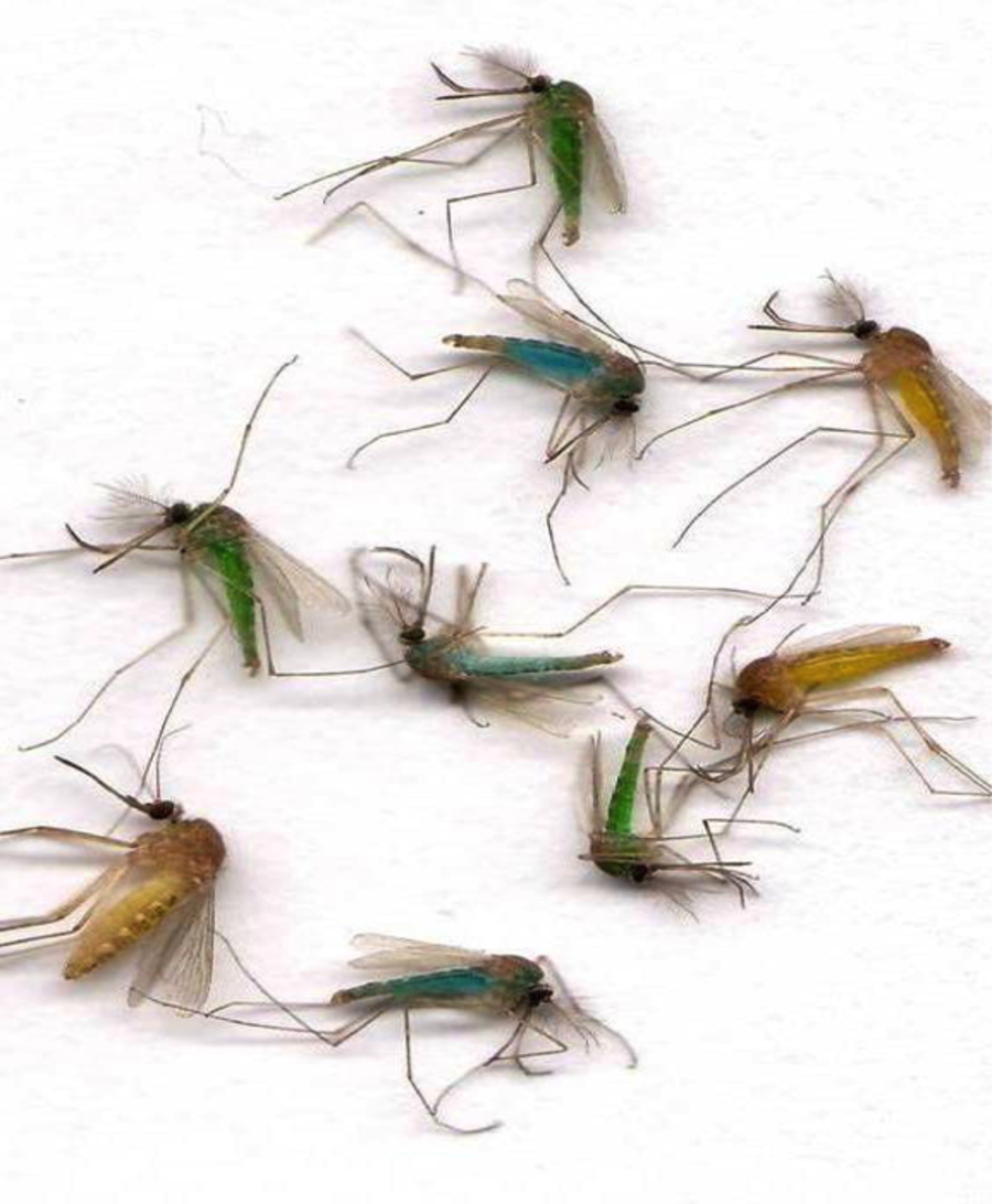 Zväčšené komáre s rôznofarebne sfarbenými bruškami, pre ľahšiu identifikáciu zlúčenín. Foto: Edita Révay (archív)