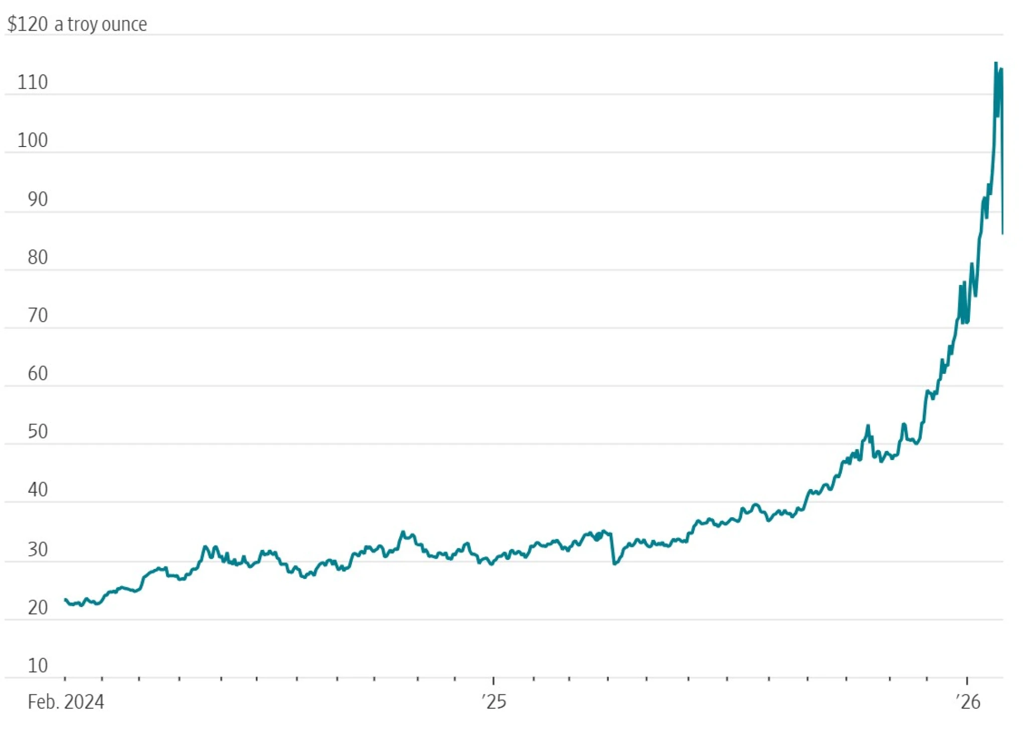 Piatok 30. januára sa zapíše do dejín. Za jediný deň sa totiž spotová cena striebra prepadla o vyše 30 percent, čo predstavuje najväčší jednodňový pokles v histórii. Futures ceny klesli o 31 percent, čo je najhorší pokles od marca 1980. Z rekordnej úrovni 120 dolárov sa v priebehu pár hodín dostala cena striebra na zhruba 84 dolárov.