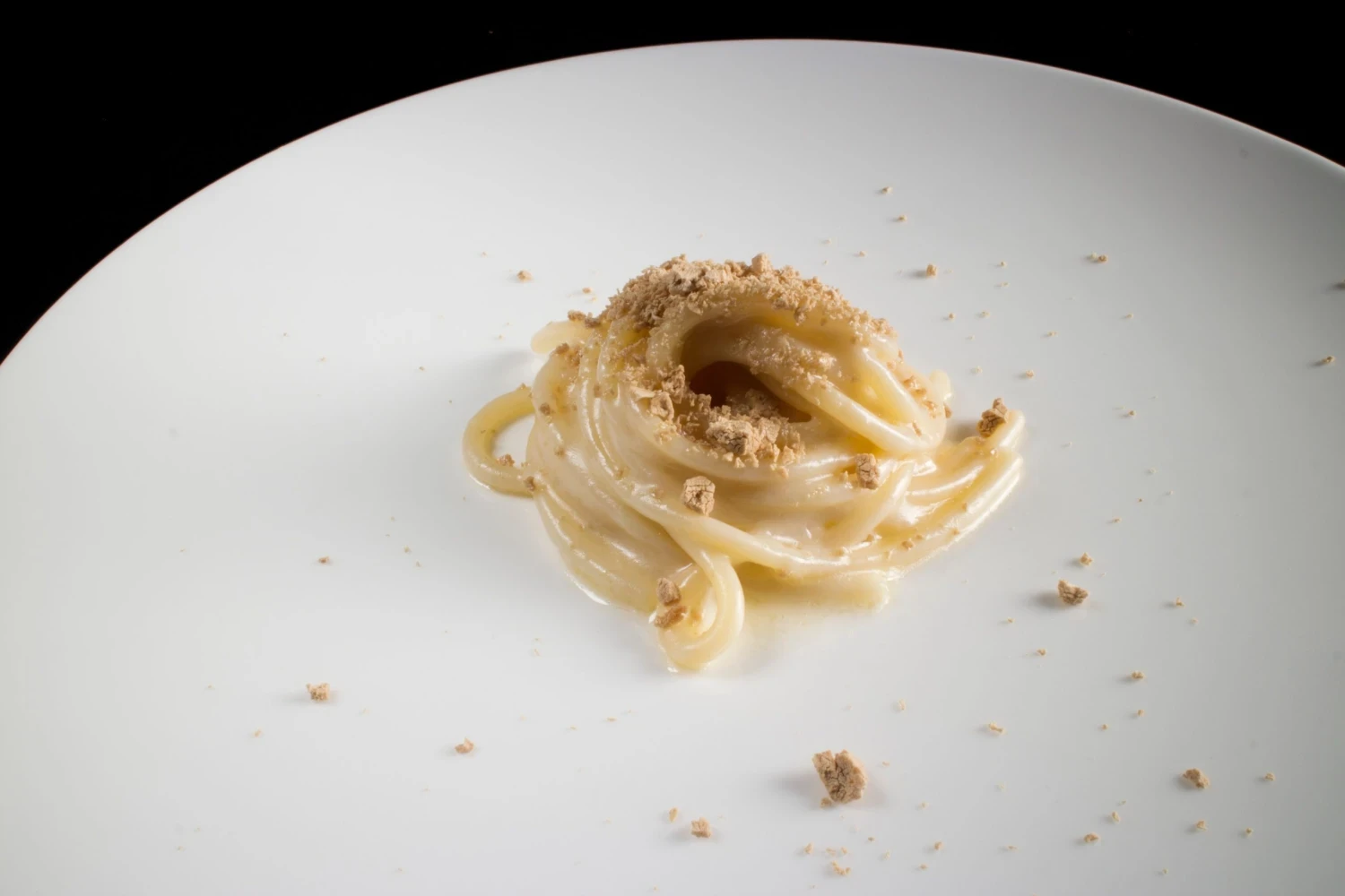 Pri druhej návšteve sme si k menu pridali spomínané cacio e pepe – tu však pripravené mimoriadne originálne, v bravčovom mechúre. Riccardo hovorí, že toto jedlo spája tradíciu a inovácie, techniku, prekvapenie a spomienku.