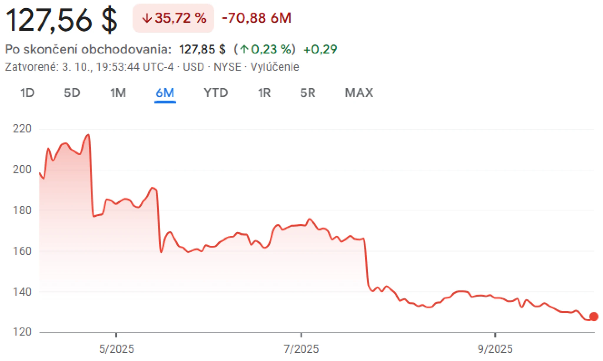 Aj z hľadiska valuácie po poklese sa situácia pre investorov mení. Ak by sme vzali do úvahy stred predpokladaného upraveného zisku na akciu – EPS – na tento rok, približne 10,22 dolára, a porovnali ho so súčasnou cenou akcie okolo 127 dolárov, dostaneme forward P/E pomer približne 12,4.