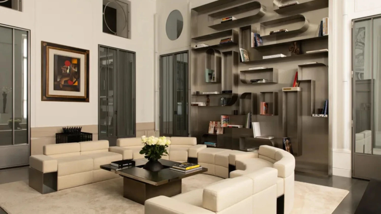 Obývacia izba má vysoké stropy a neprehliadnuteľné dvojité oceľové knižnice od podlahy až po strop, v ktorých nechýbajú ani výtlačky niektorých z najikonickejších kníh módneho sveta. Obytná časť plynulo nadväzuje na jedáleň, bar a dve kuchyne, z ktorých jedna je profesionálna, čím vzniká ideálne prostredie pre súkromné stretnutia alebo komornejšie podujatia.