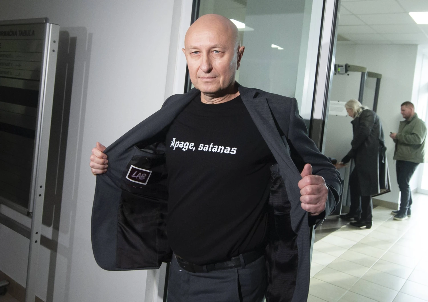 Prechádza bez slova, v čiernom tričku s nápisom „apage satanas“ (odstúp, satan), ktorým dáva najavo pohŕdanie už z diaľky. Novinári si už zvykli, rovnaké tričko si obliekol aj na úvodné pojednávanie.