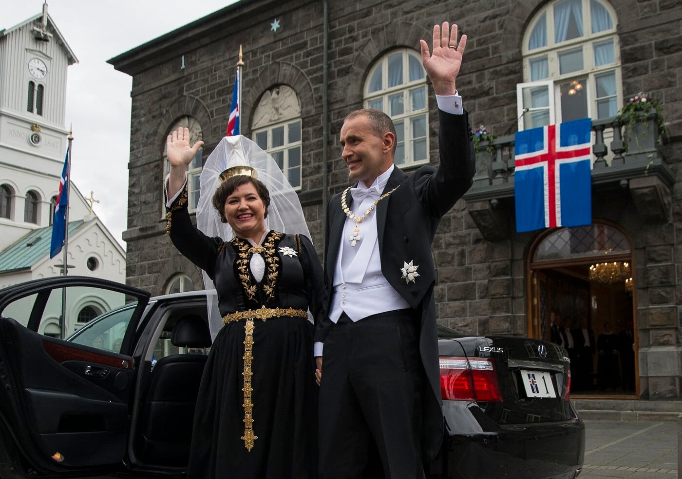 Prezident Islandu Guðni Jóhannesson a jeho manželka Eliza Reid mávajú pred slávnostnou ceremóniou v Reykjavíku 1. augusta 2016. Foto: Profimedia