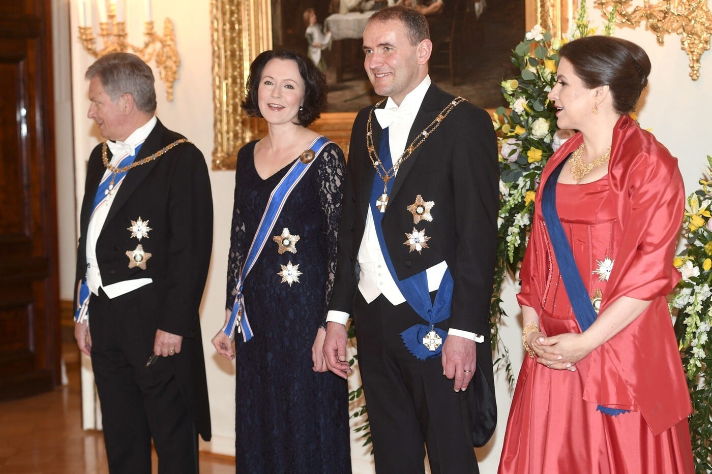 Prezident Fínskej republiky Sauli Niinisto (vľavo) so svojou manželkou Jenni Haukio usporiadali slávnostnú večeru pre prezidenta Islandu Gudniho Thorlaciusa Johannessona a jeho manželku Elizu Jean Reid (vpravo) v prezidentskom paláci v Helsinkách vo Fínsku 15. mája 2018. Foto: Profimedia