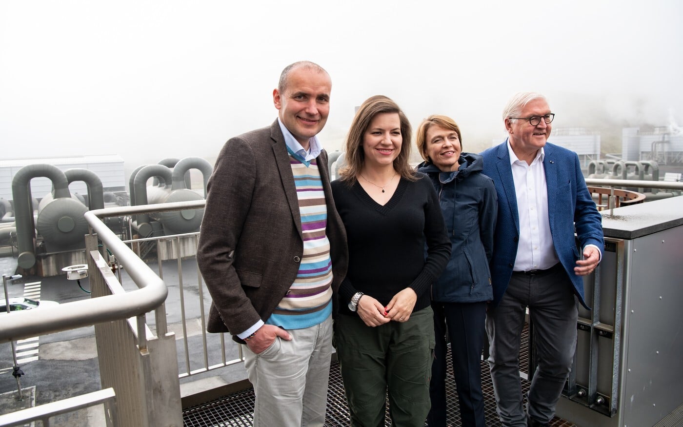 Nemecký prezident Frank-Walter Steinmeier (vpravo) a jeho manželka Elke Büdenbender (druhá sprava) navštívili geotermálnu elektráreň Hellisheidei spolu s Gudnim Thorlaciusom Jóhannessonom (vľavo), prezidentom Islandu, a jeho manželkou Elizou Reid (druhá zľava).