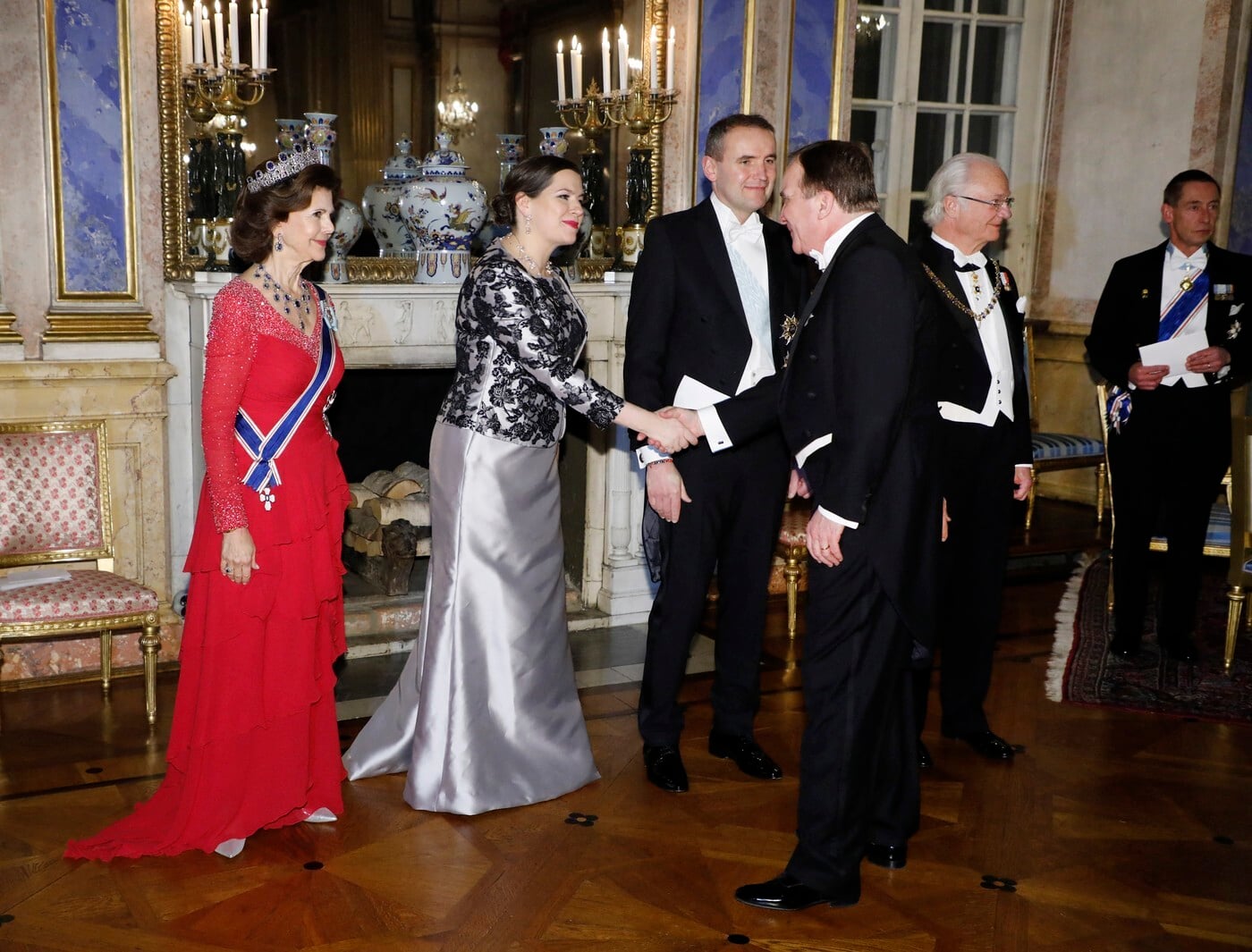 Švédsky premiér Stefan Lofven víta podaním ruky islandskú prvú dámu Elizu Jean Reid a jej manžela, v tom čase islandského prezidenta Guðniho Jóhannessona. Spločne pózujú so švédskym kráľovským párom pred banketom v kráľovskom paláci v Štokholme. Foto: Profimedia