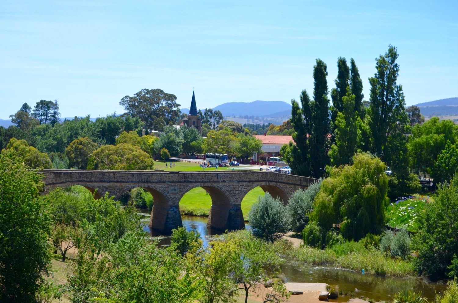 Starý kamenný most mal tiež svoje historické čaro a v jeho okolí pobehovali deti, ktoré práve povyskakovali z autobusu. Očividne sem prišli v rámci školského výletu. Bol práve čas obeda, a tak sa lúka pri moste postupne zaplnila dekami a piknikovými košmi, terasy kaviarní boli tiež odrazu plné ľudí užívajúcich si príjemné teplé počasie. Mala som šťastie na krásne slnečné dni počas celého pobytu, čo považovali priam za zázrak aj samotní Tasmánčania.