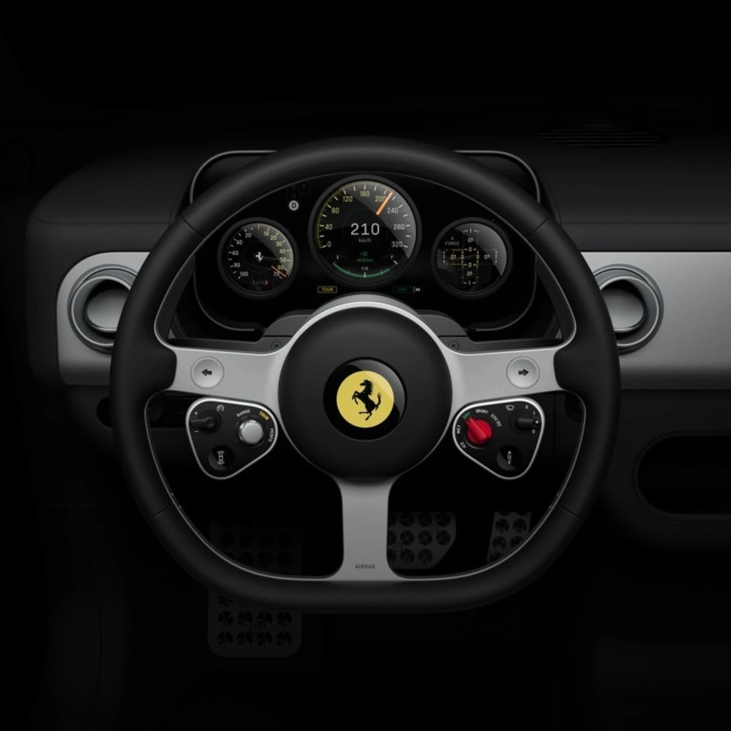 Nech sa páči. Teraz sa však vráťme späť na zem. Čiastočne. O troch hlavných ciferníkoch priamo pred vodičom dizajnéri hovoria, že ich podoba je ovplyvnená avionikou, najmä starými vrtuľníkmi. Na ich spracovanie si LoveFrom spolu s Ferrari najali Samsung.