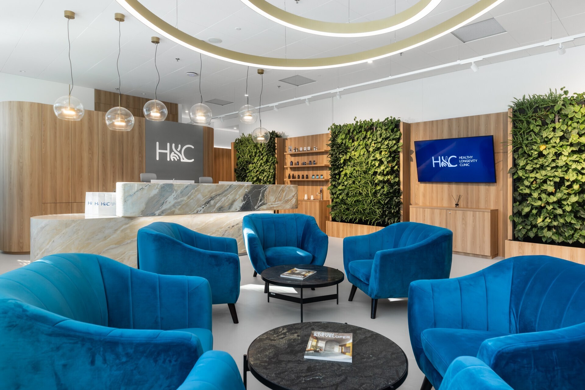 Priestory Healthy Longevity Clinic na pražskom Chodove prepájajú prírodné materiály a zeleň. Nová klinika v areáli The Park svojím vzhľadom pripomína skôr wellness centrum než tradičné zdravotnícke zariadenie. Na ploche takmer 600 štvorcových metrov vzniklo deväť ordinácií, kde lekári a ďalší odborníci pomáhajú pacientom s omladením.