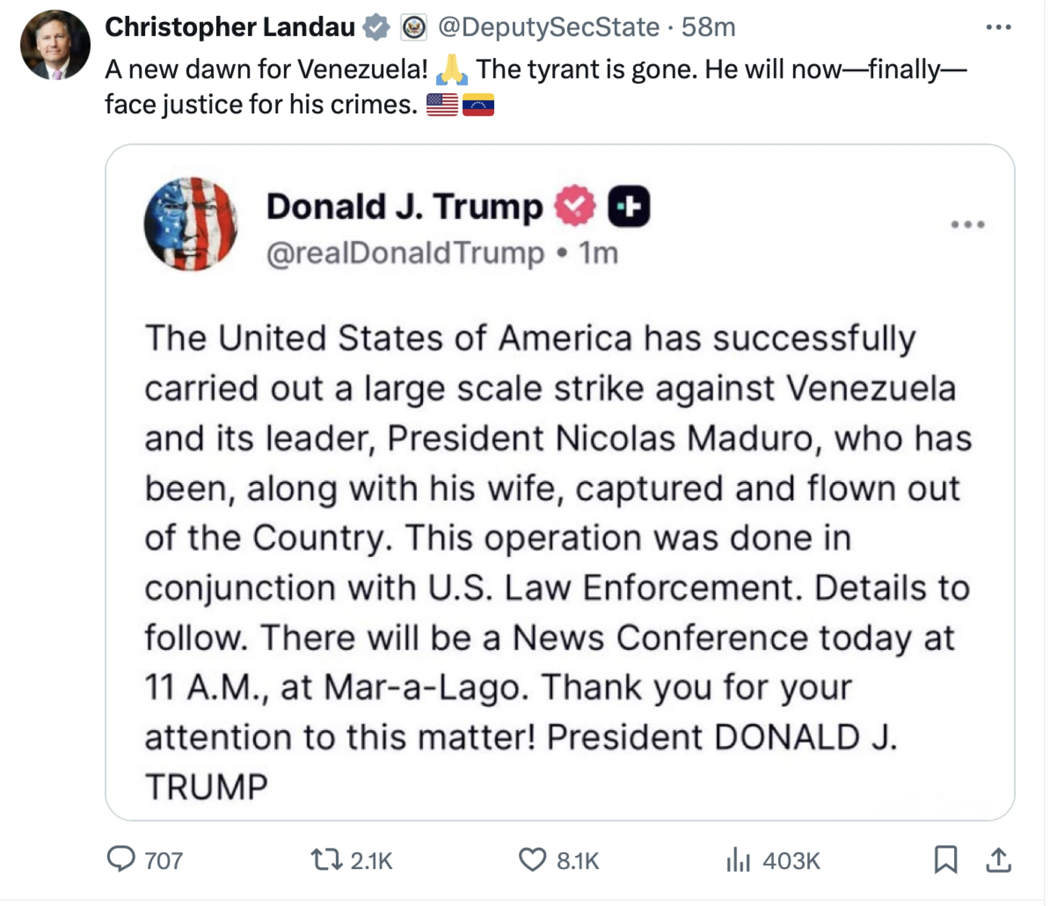 Americký prezident Donald Trump prostredníctvom sociálnych sietí uviedol, že USA uskutočnili „rozsiahly úder“ vo Venezuele a že Maduro a jeho manželka boli zajatí a prepravení mimo krajiny. Nezávislé zdroje zatiaľ tieto tvrdenia nepotvrdil a venezuelská strana neposkytla oficiálne informácie o ich aktuálnom pobyte.