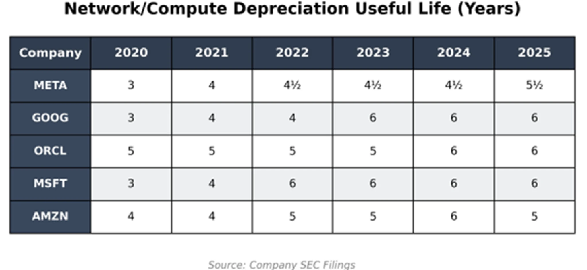 Z troch až štyroch rokov v roku 2020 a 2021 sa životnosť výpočtových a sieťových aktív pre spoločnosti ako Meta, Google či Microsoft predĺžila na päť a pol až šesť rokov v roku 2025.